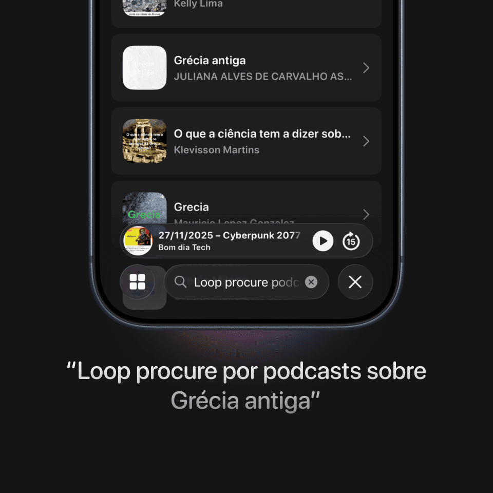 Peça ao Loop para encontrar podcasts usando linguagem natural como "Loop encontre podcasts sobre crime verídico".